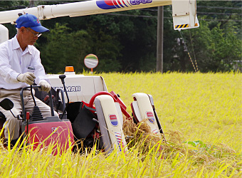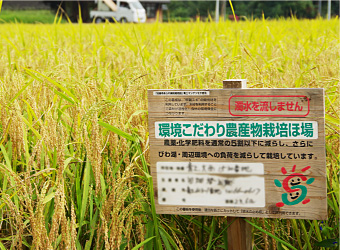 弊社が契約栽培しているすべての農家の皆さんの農地には、「エコじまん」の立札が立っています。お米が出来るまでには、通常10回以上の農薬散布が必要ですが、「エコじまん」は、1回のみの散布で、それも自然にやさしい農薬散布です。おたまじゃくし、水すまし、カブトエビ、どじょう、その年の天候によって異なりますが、蛍も帰って来る程、自然豊かな田んぼです。これからも米作りを通して、自然と環境づくりに貢献していきます。