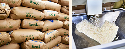 産地から届いた玄米は、自社工場内で精米・洗米します。米の産地や生産者、等級などがきちんとわかるという意味もあり、手間がかかってもこの行程にはこだわります。洗米された米は夏場6時間、冬場8時間水に浸してから蒸されます。