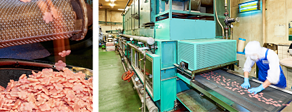 但馬の小京都と呼ばれる美しい城下町、兵庫県出石。緑の山々に囲まれ、穏やかなたたずまいを見せるこの地に法善寺あられの工場があります。工場といってもすべてを機械のラインに頼るわけではありません。要所要所は手作業で、全工程を約10日間かけてじっくりと仕上げます。昔ながらの製法を守りつつ新しい技術も取り入れて、「美味しさ」「安心」を追求しています。