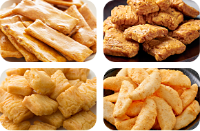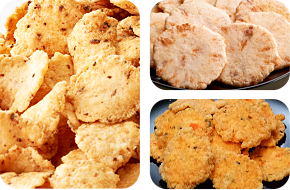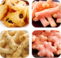 法善寺あられの人気商品、牛せんシリーズや海老ぼたんはフライによる製品です。