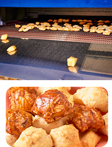 焼く距離の長い窯で、えびさんご、花あられ、ごぼうおかき、豆もちなど、